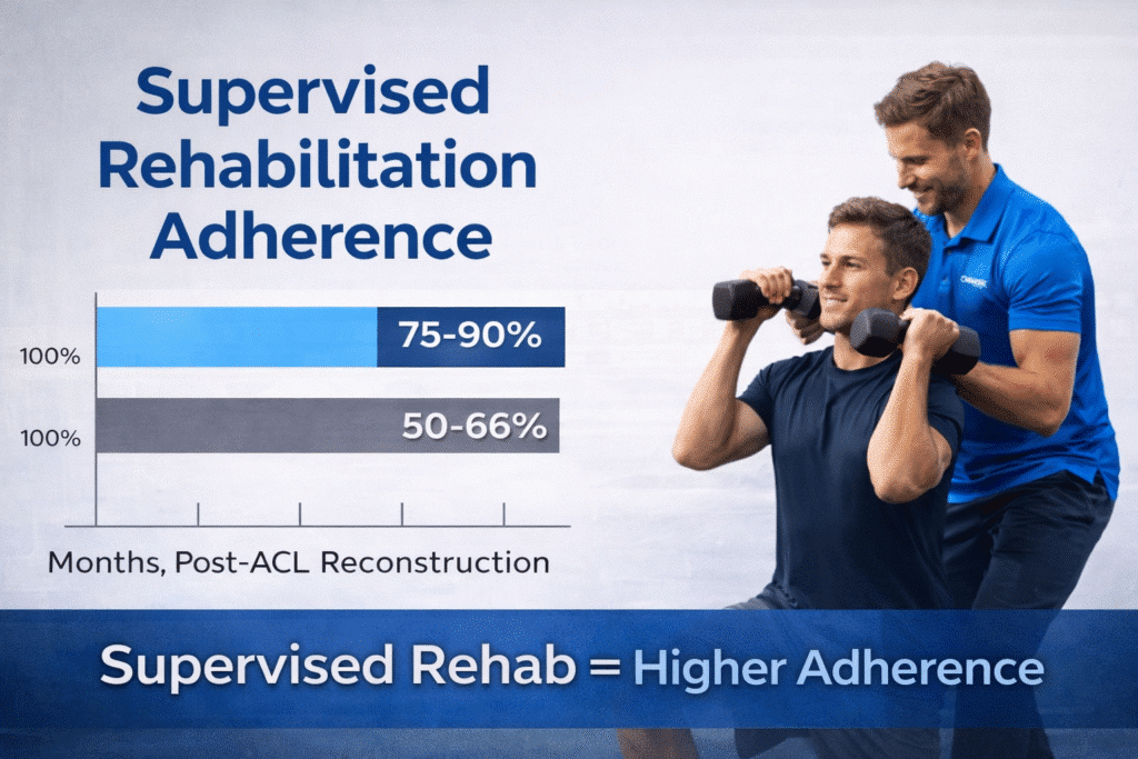 Systematic review evidence demonstrates that supervised musculoskeletal rehabilitation programs achieve significantly higher adherence rates compared to unsupervised home programs. Supervised programs often report adherence rates of approximately 70–90%, compared to 50–65% for home-based programs.